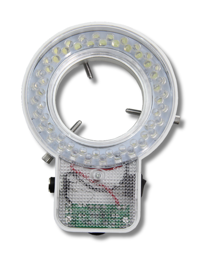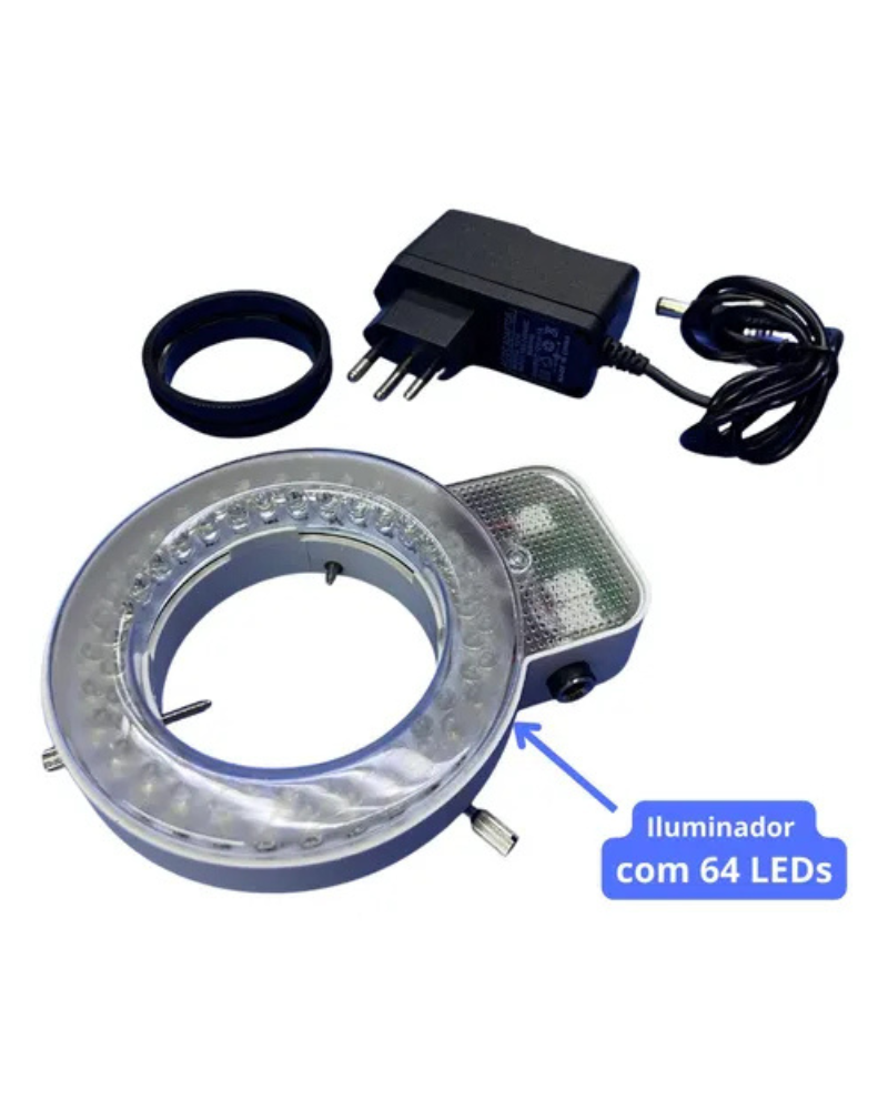 O Iluminador Circular/Anelar de LED contendo 64 LEDS inclui um anel de luz LED, um adaptador de alimentação 110-240V e um adaptador de montagem do anel.